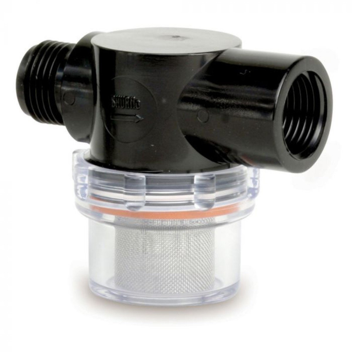 Het Shurflo filter voorkomt dat er vuil uit de watertank in de membraanpomp kan komen.